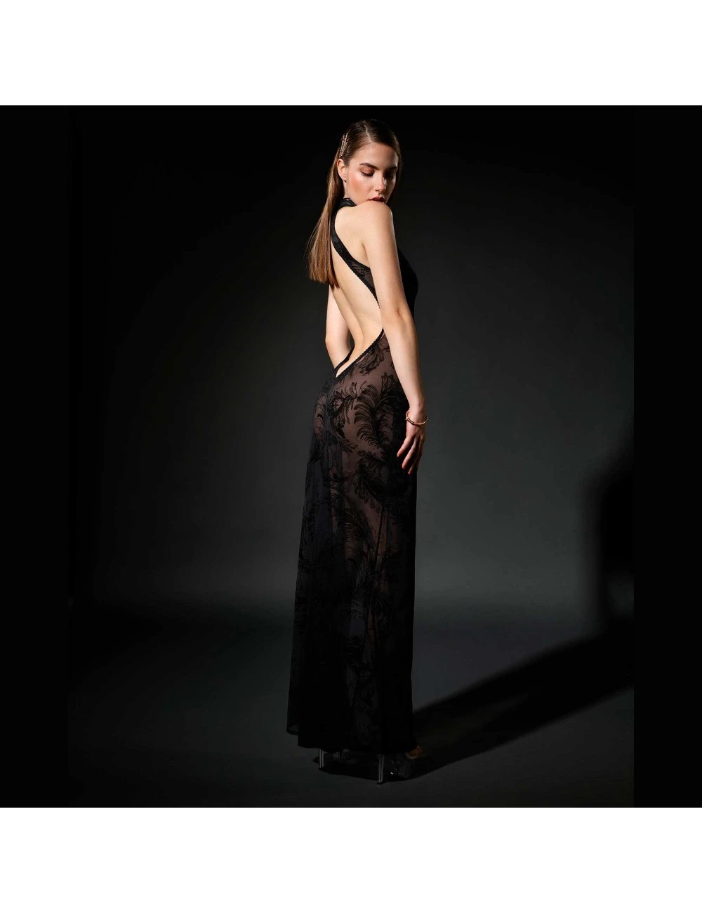 Robe longue noir en résille transparente avec des motifs de plumes.