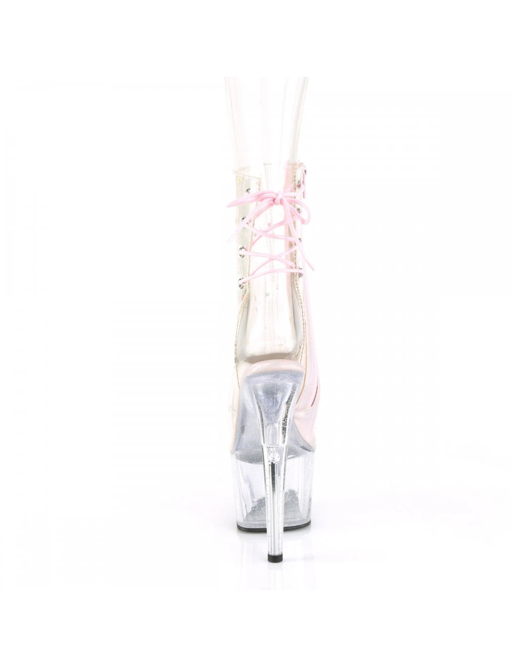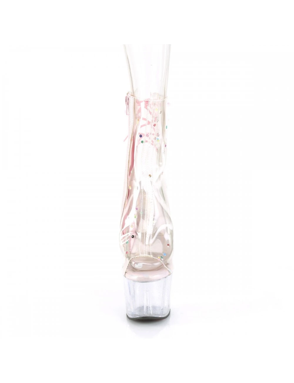 Modèle entièrement transparente de la collection Adore avec ouverture sur le devant et au niveau du talon avec un joli laçage rose derrière la cheville.