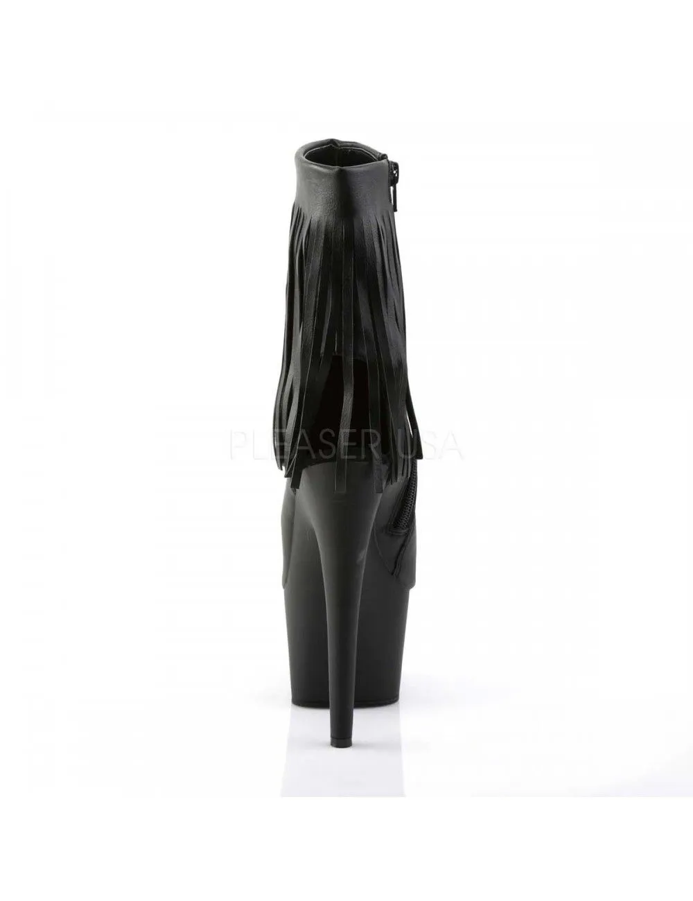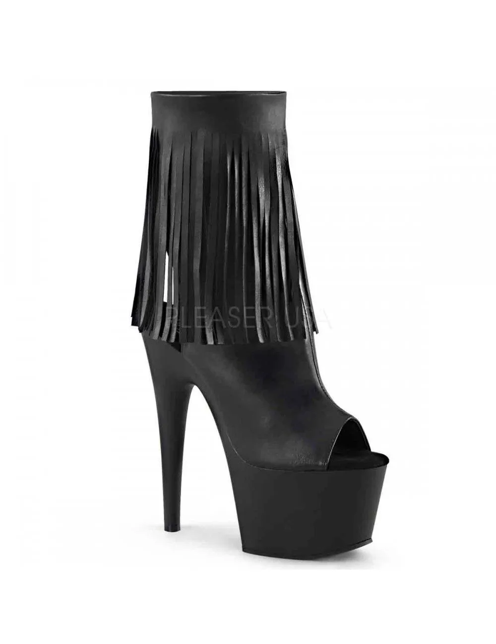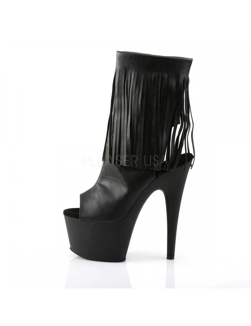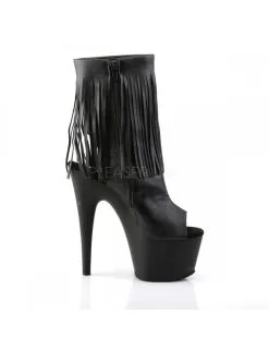 Jolies bottines noir mat ouvertes avec une frange tout autour.
