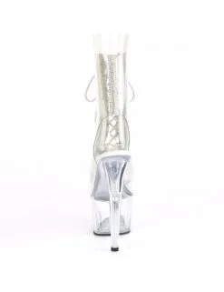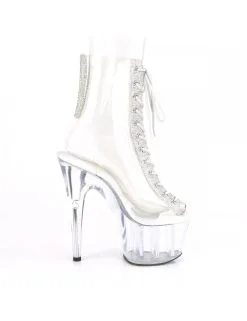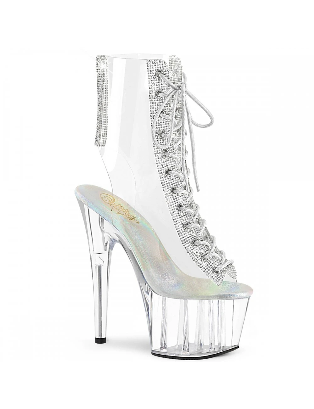 Magnifique bottines plateformes transparentes ouvertes devant et derrière avec un laçage sur le dessus du pied accompagné de strass.