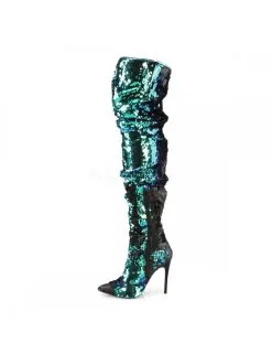 Cuissardes sexy Ă talon aiguilles de plus de 11cm avec sequins en reflet vert.