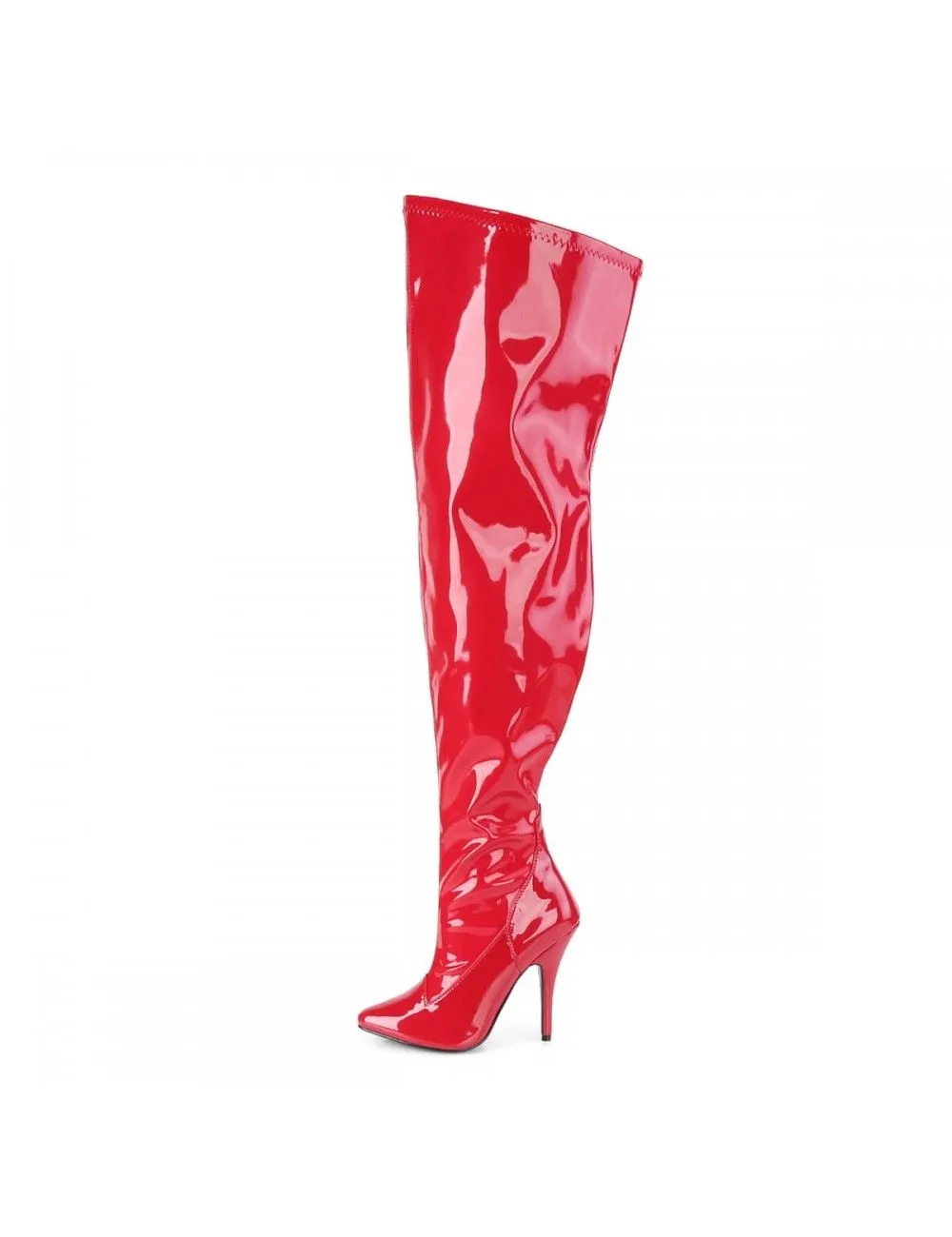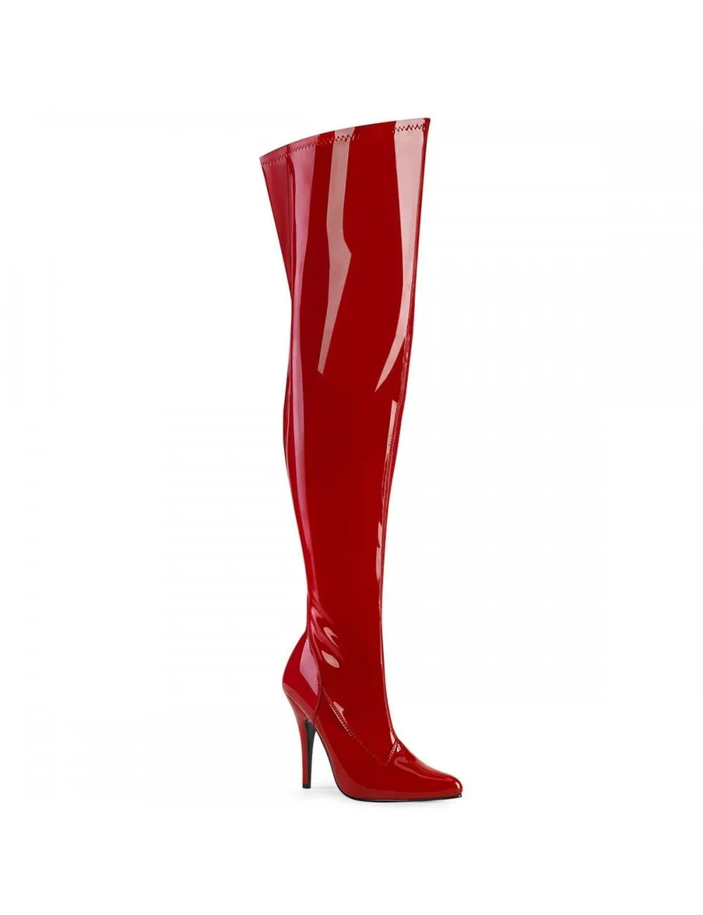 Cuissarde rouge vernis de conception large avec une taille haute montant sur la cuisse.
