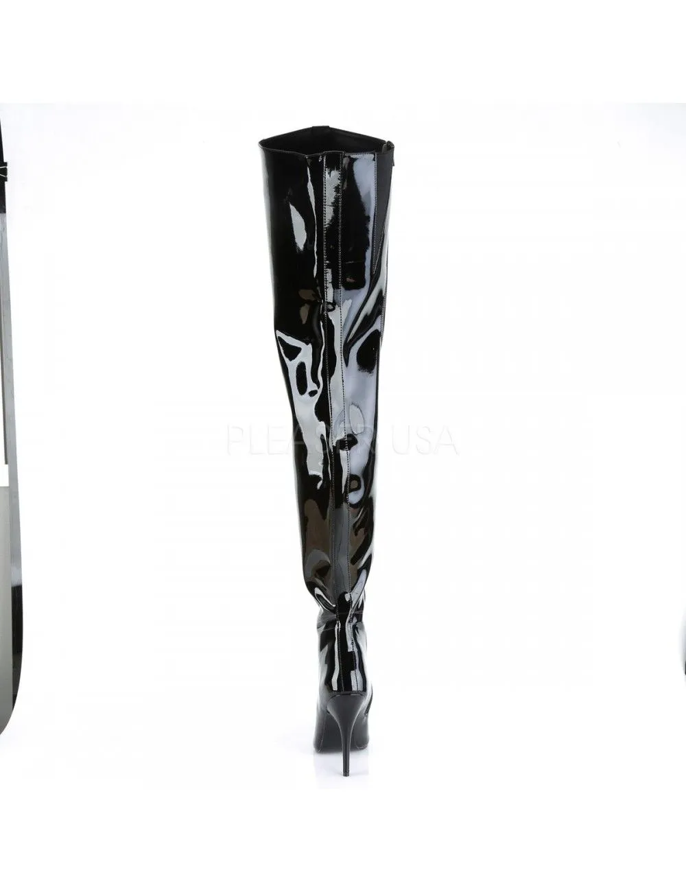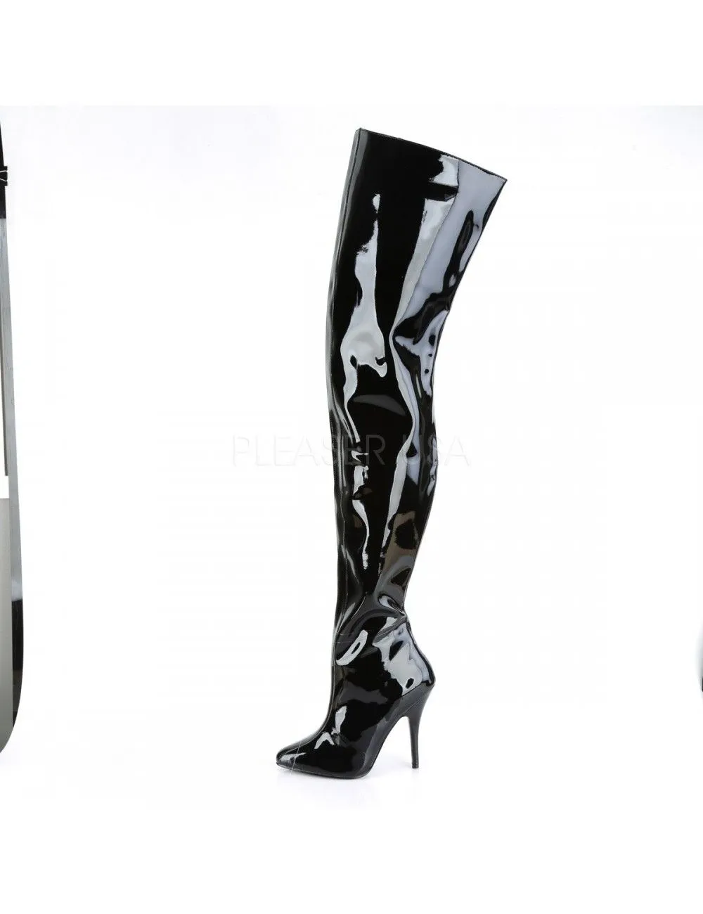 Cuissardes montantes noires vernis et talon de plus de 12 cm de haut.