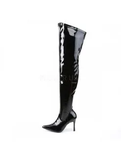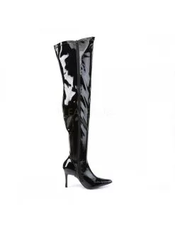 Cuissardes en vinyle noir brillant avec son talon aiguille de plus de 9 cm.