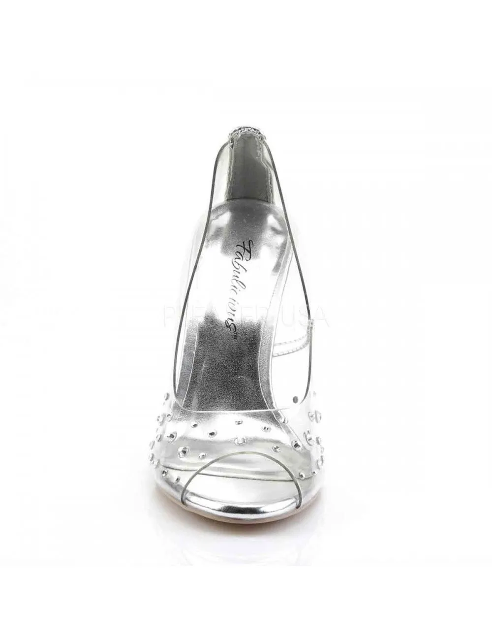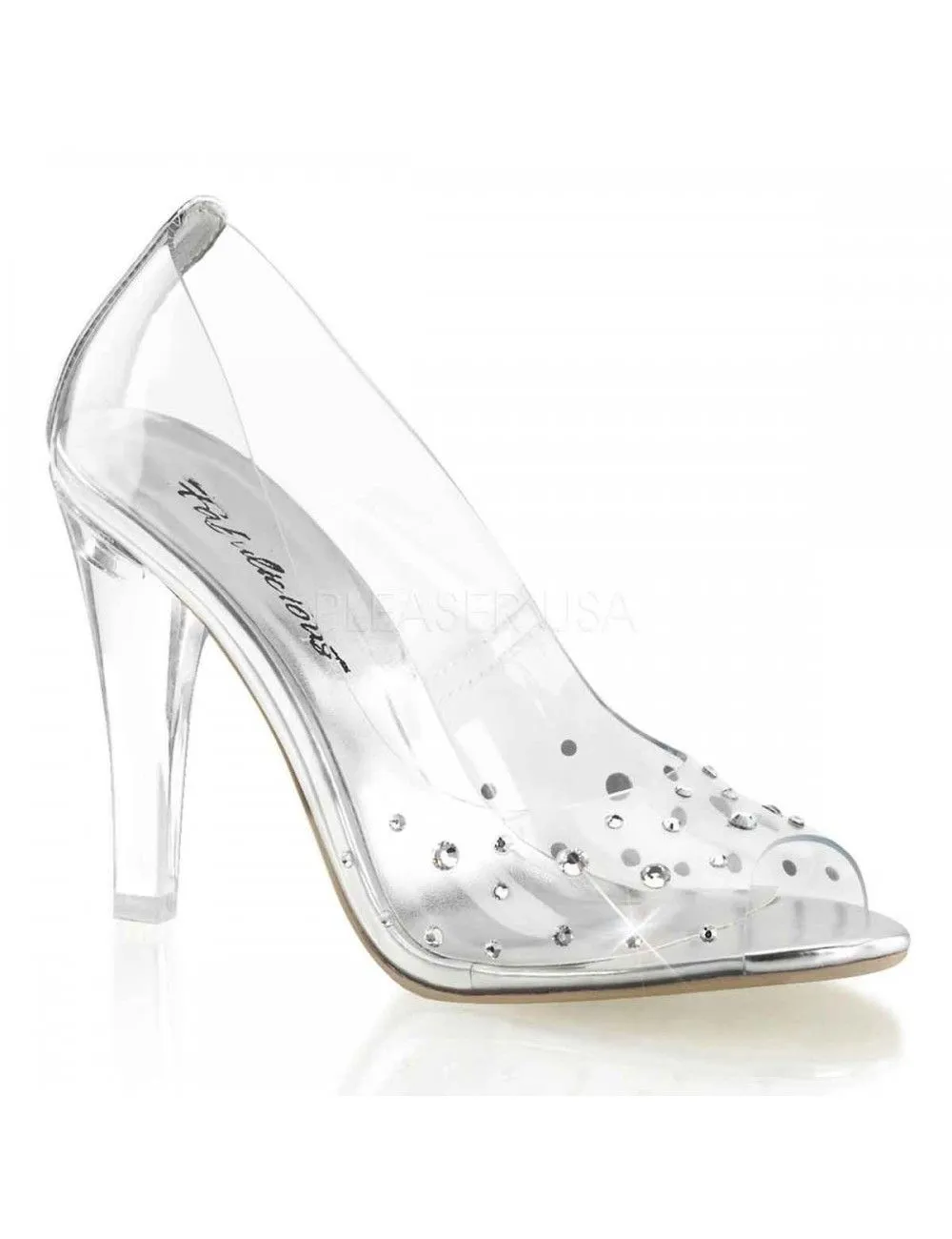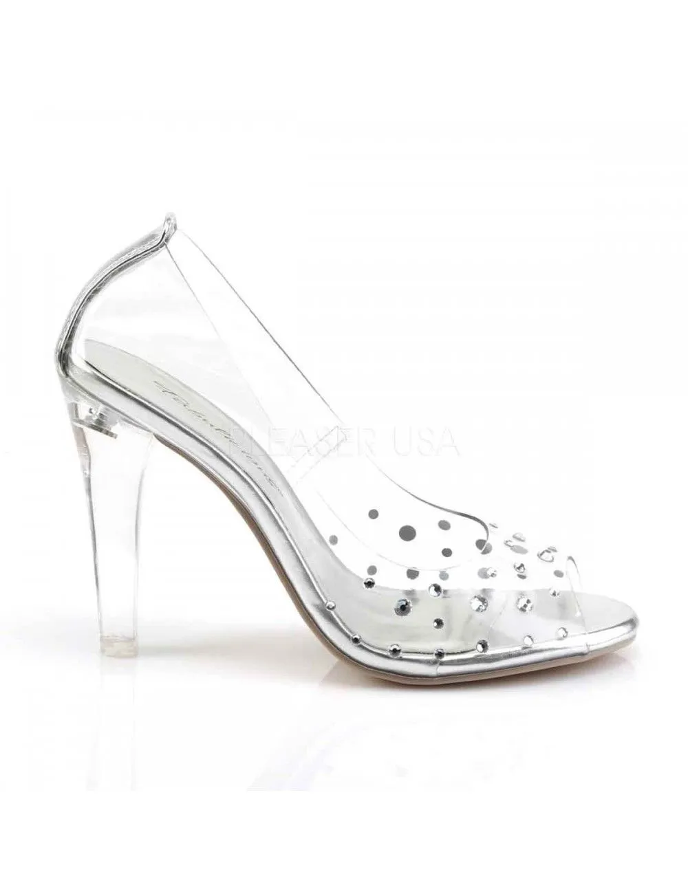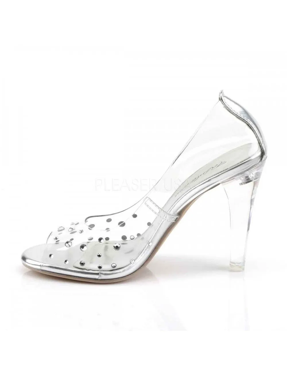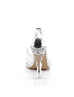 Magnifique escarpin transparent agrémenté de petit strass sur le dessus du pied.