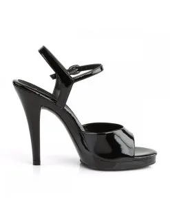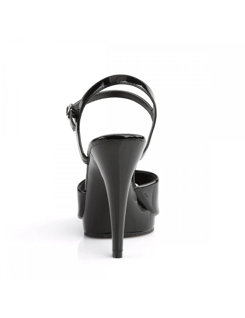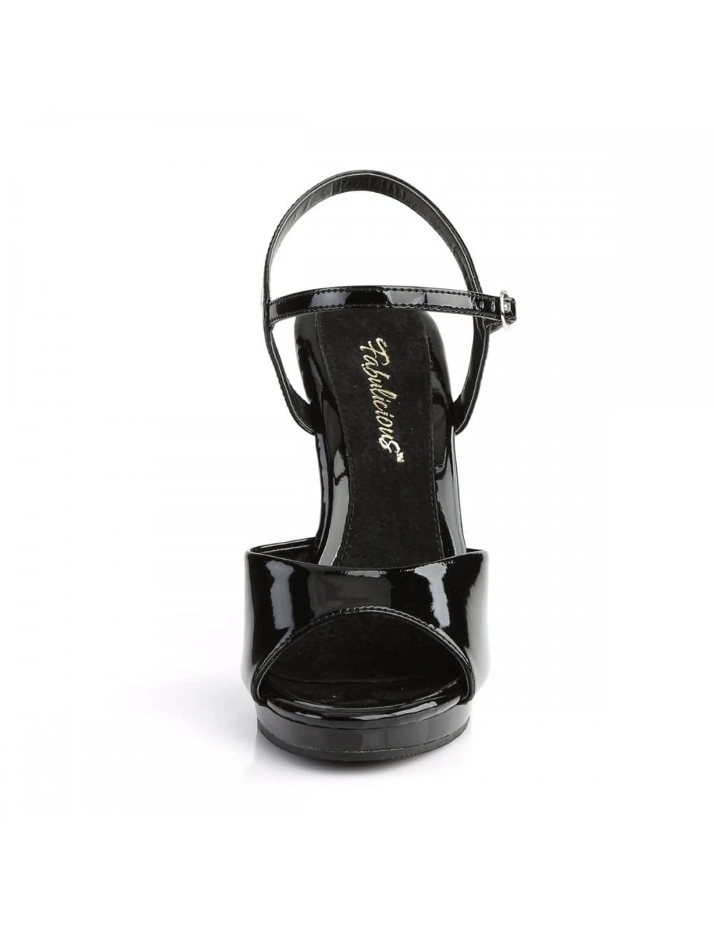 Sandales plateforme sensuelles et Ă©lĂ©gantes avec son effet brillant du vernis, l’ensemble de la chaussure est en coloris noir.