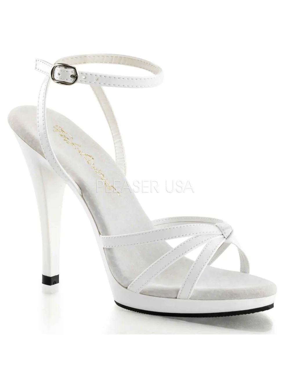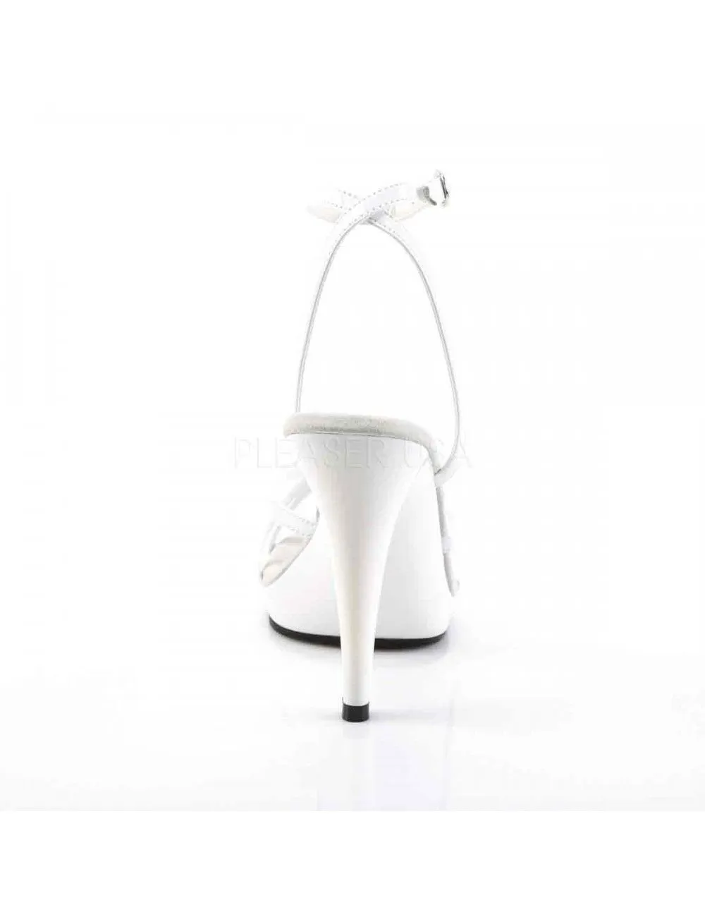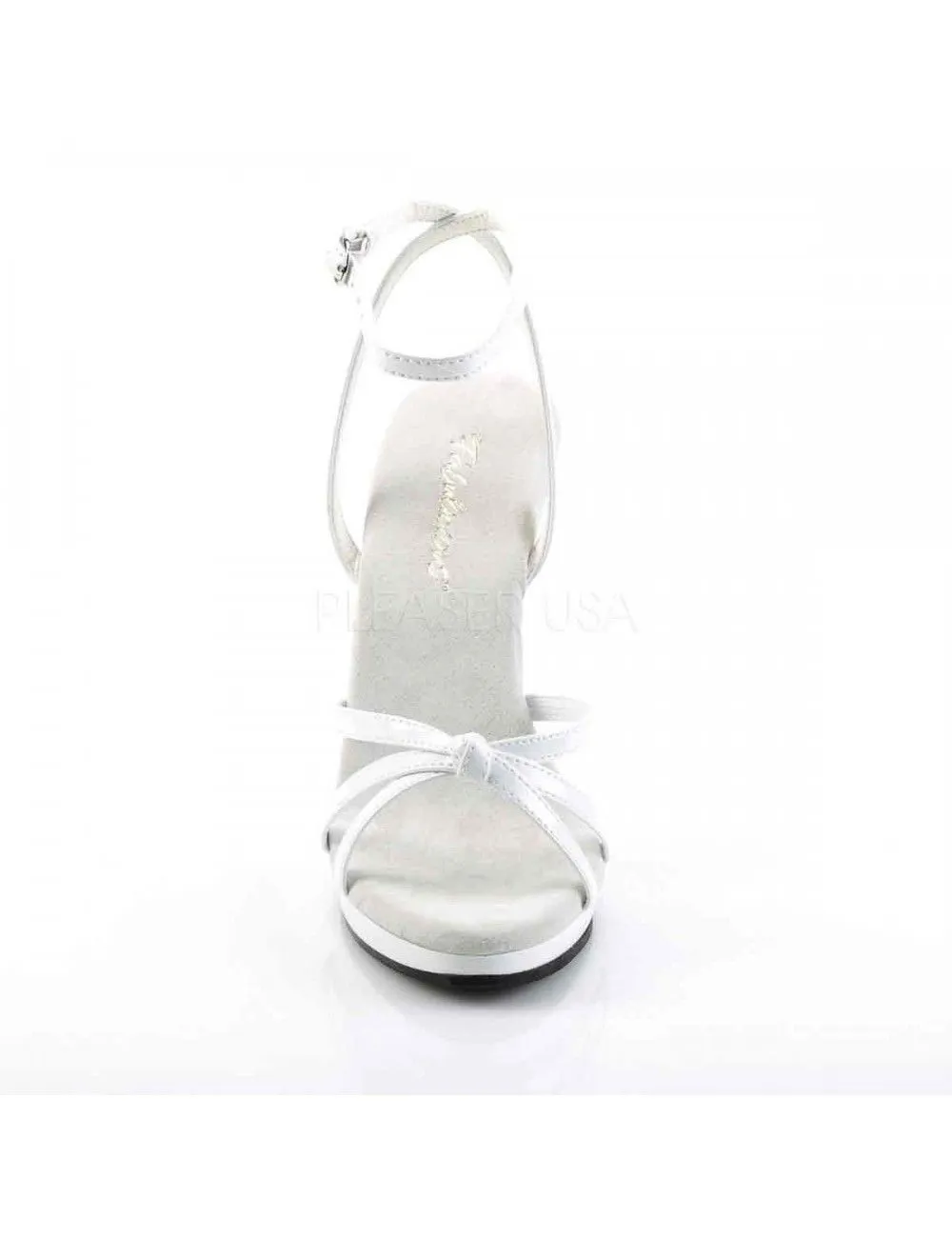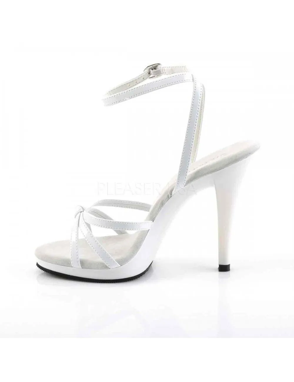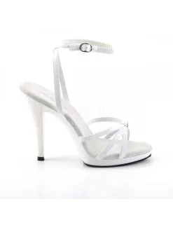 Sandales sensuelles blanc brillant. Ultra-féminine avec un talon haut de 11.43 cm. Bride de maintien croisée sur la cheville.