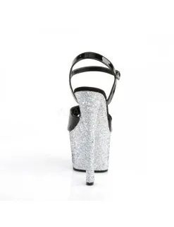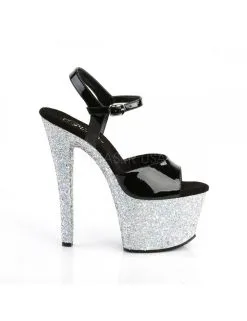 Sandales Noir Vernis Haut Talon Plateforme Pailletée Argent Pleaser