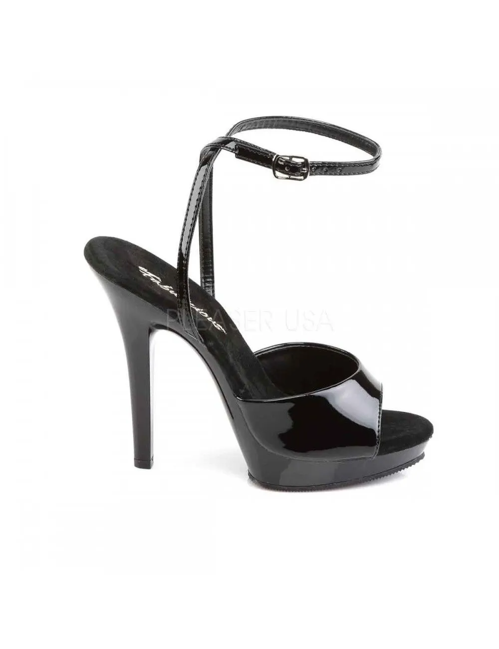 Sandales talons hauts noires vernis de plus de 12 cm et petit patin de 1.9 cm.