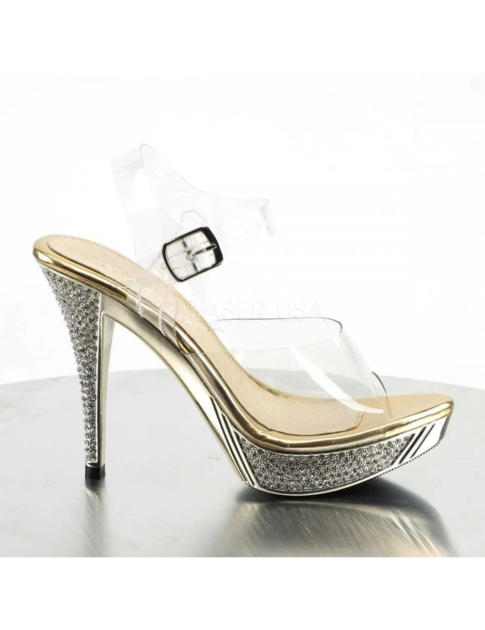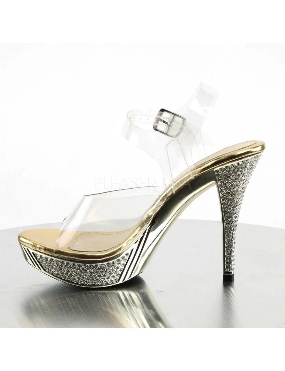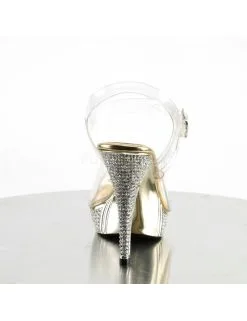 Large bride sur le pied transparente, et bride de maintien Ă la cheville.
