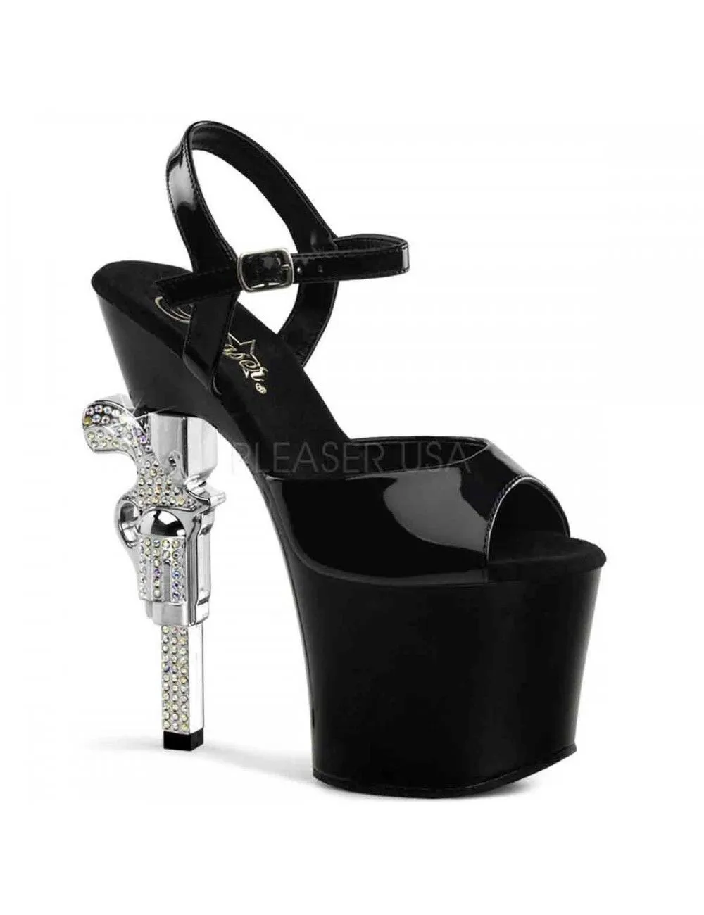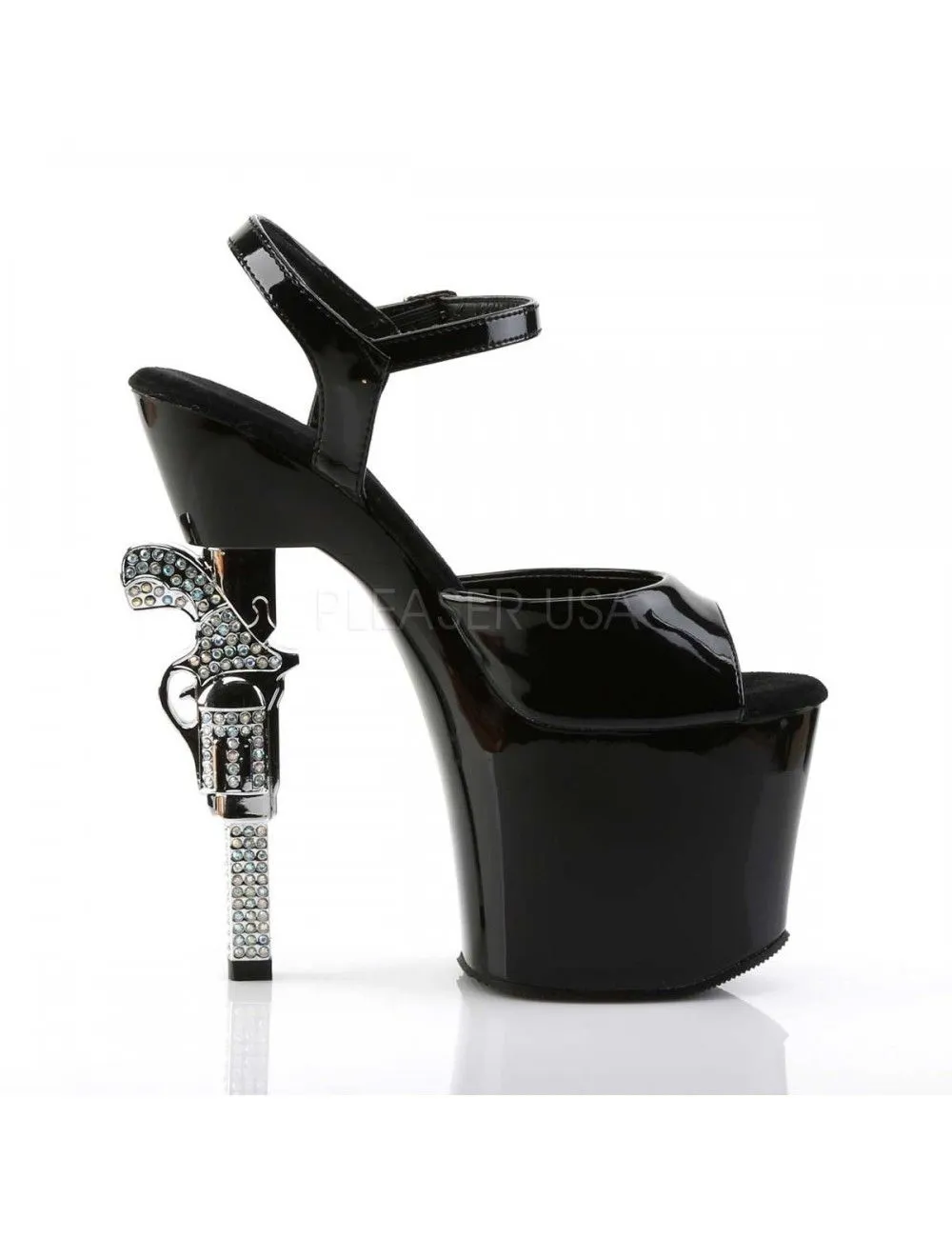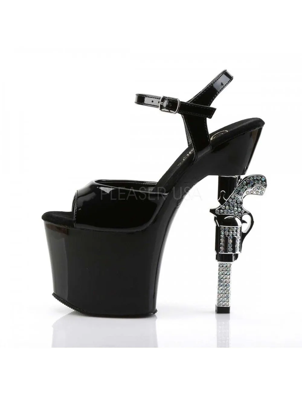 Belle originalité à la place du talon un revolver orné de strass pour un modèle unique et sexy.