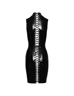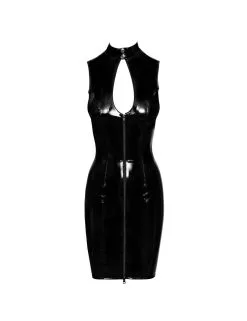 Robe courte en vinyle noir brillante sans manches mais un décolleté ravageur.