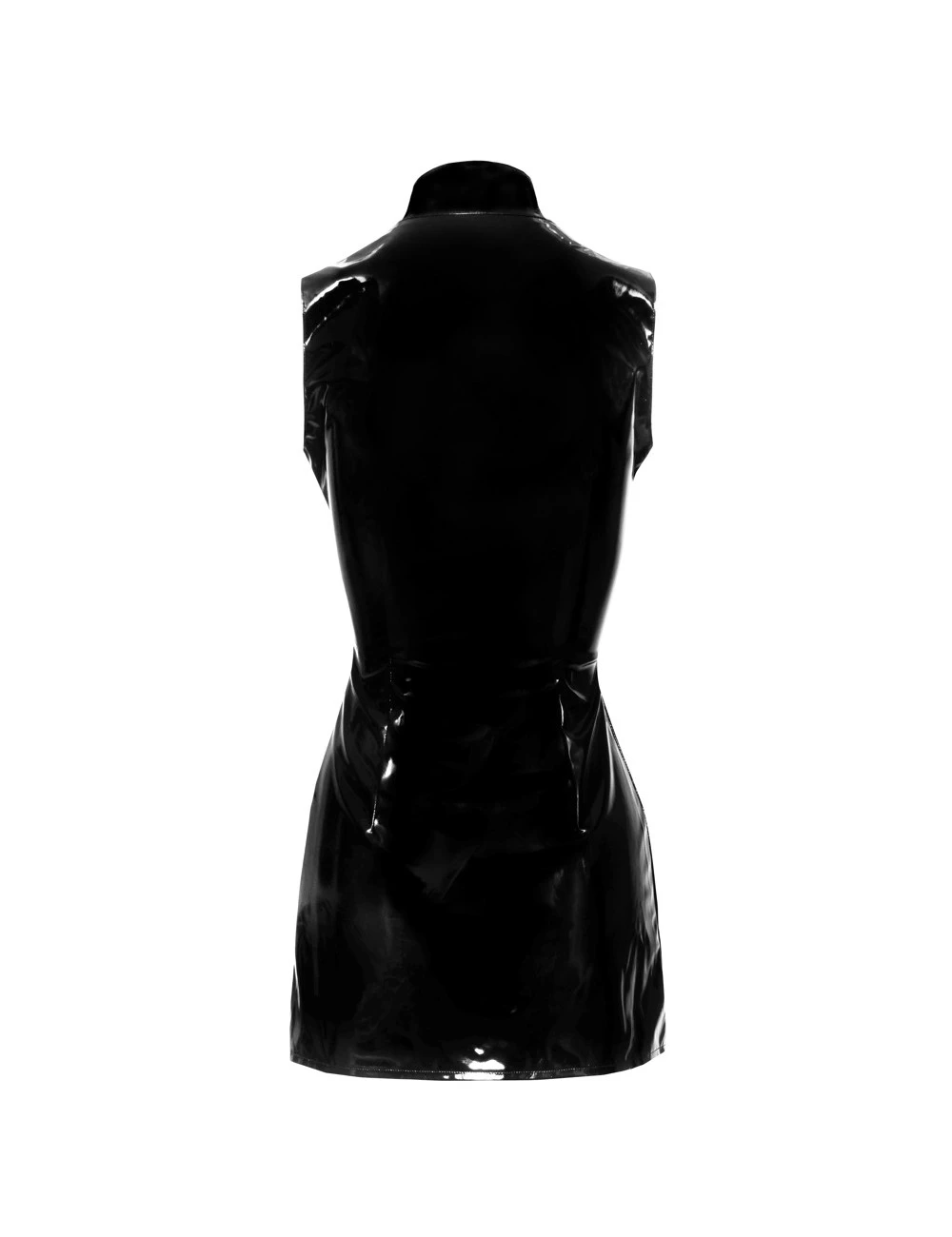 Robe courte en vinyle noir brillant sans manches. L’incontournable tenue de soirĂ©e attirante, facile Ă enfiler et qui dĂ©gage du charme.