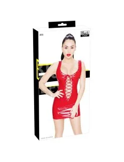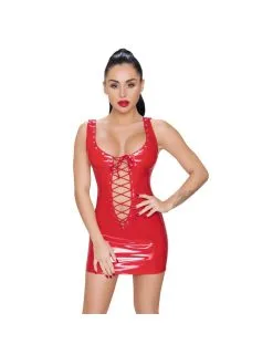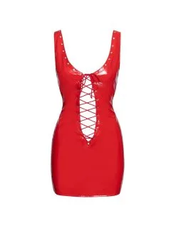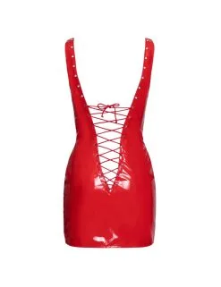 Robe courte paré de laçages croisés en vinyle rouge brillante sans manches.