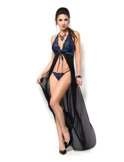 Robe lingerie longue bleu saphir en dentelle transparente sur la poitrine et fine résille noir chic.