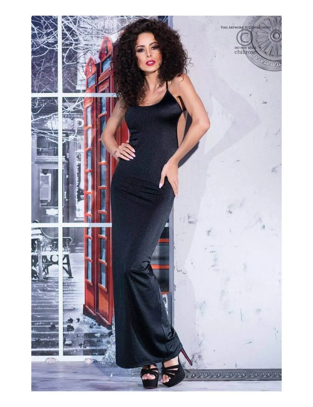 Robe longue en satin noir et empiècement de dentelle au dos avec bretelles ajustables.
