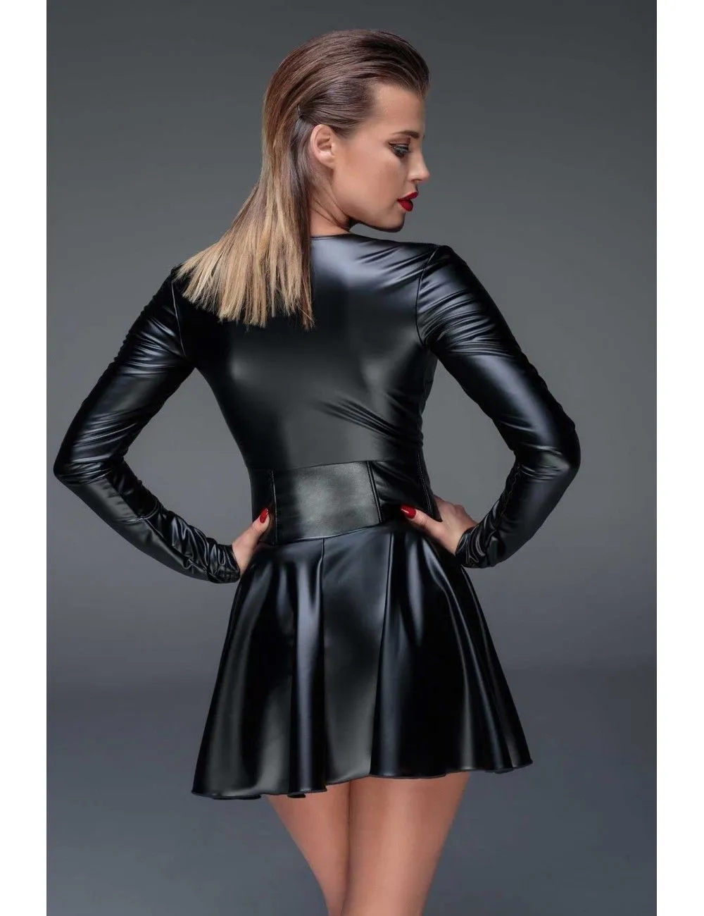Robe courte wetlook noir manches longues au look corset avec une taille mise en beauté.