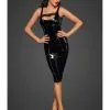 Robe en vinyle noir brillant avec épaules bouffantes et manches longues.