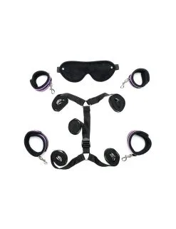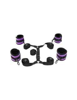 2 paires de menottes (chevilles et poignets) rĂ©glables Ă fermetures velcro viendront s’accrocher aux extrĂ©mitĂ©s des sangles.