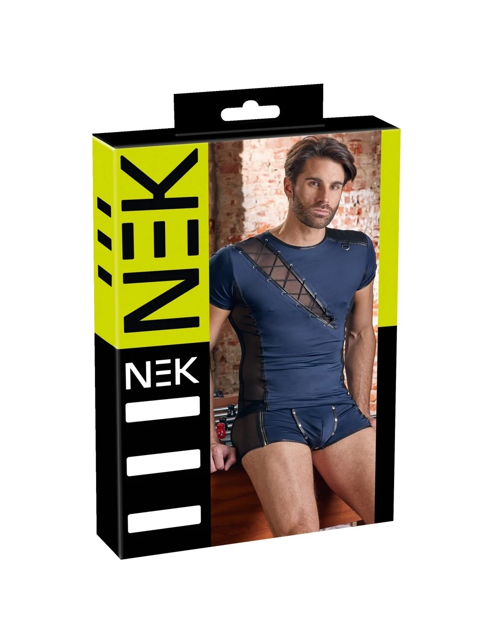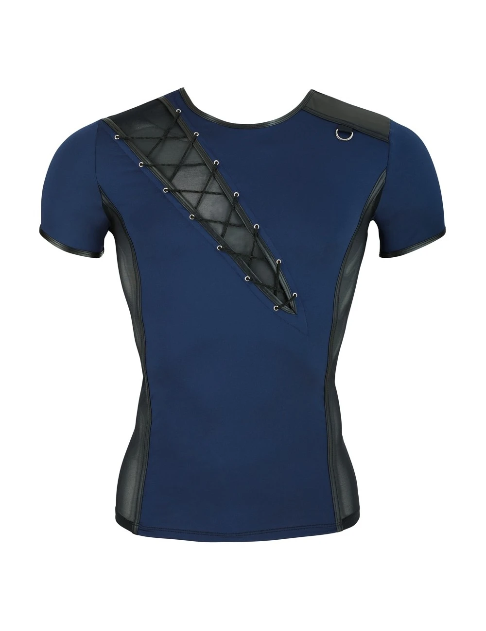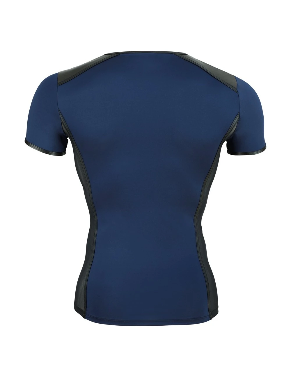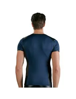 T-shirt accrocheur en bleu et noir, se distingue des autres par la combinaison extrêmement extensible de microfibre opaque et douce et de powernet transparent avec des détails tendance au look mat.