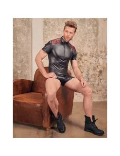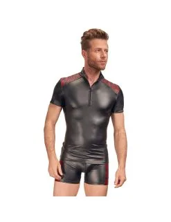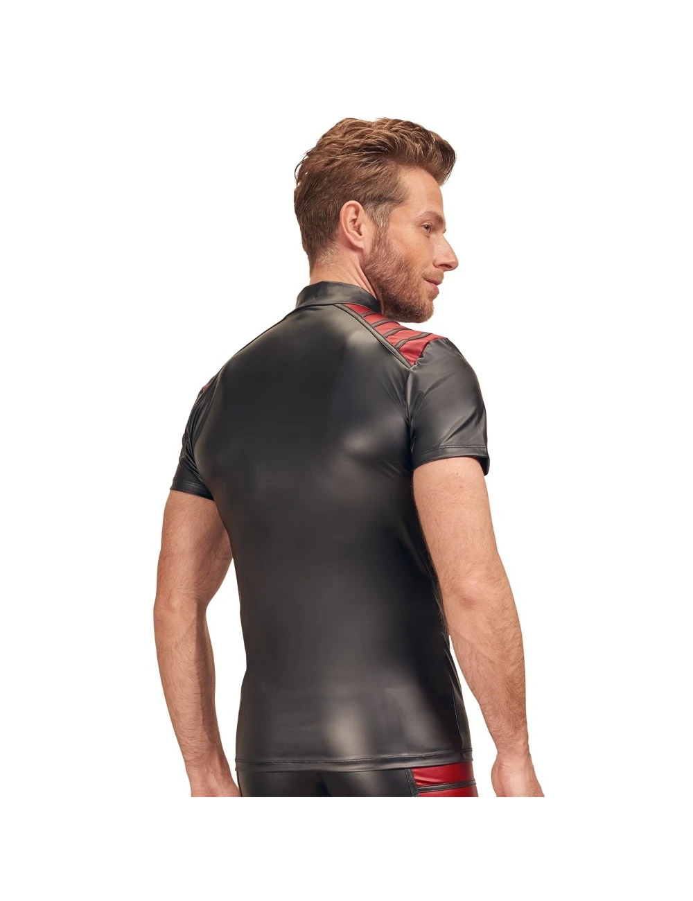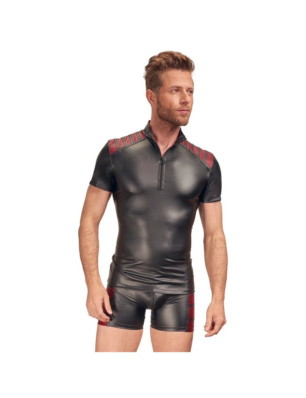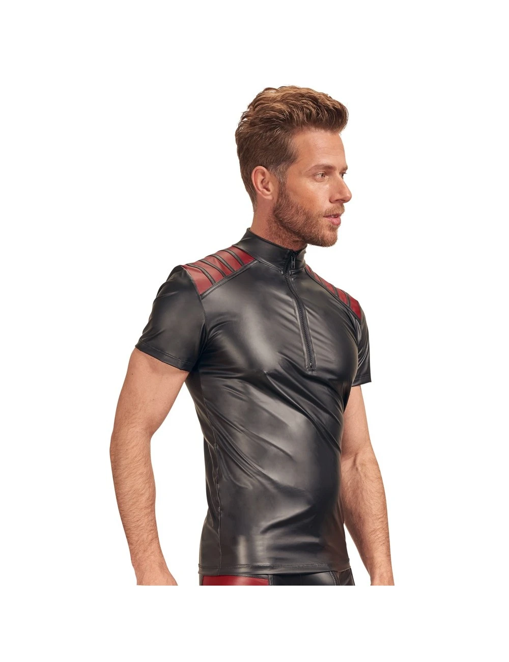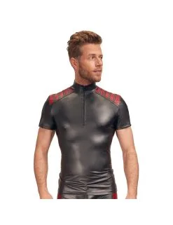 T-shirt noir en matière tendance Ă l’aspect mat avec empiècements rouges sur les Ă©paules. Il y a un petit col montant et un zip sur le devant.