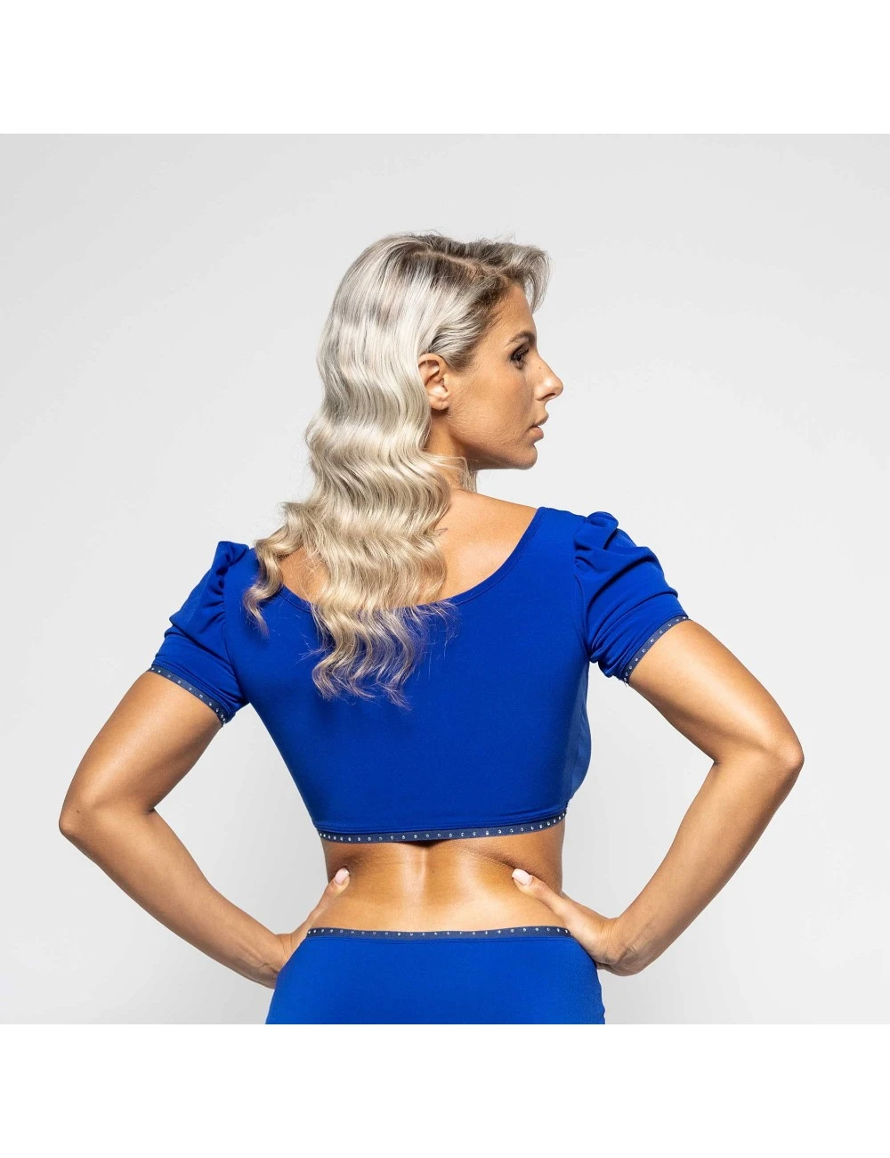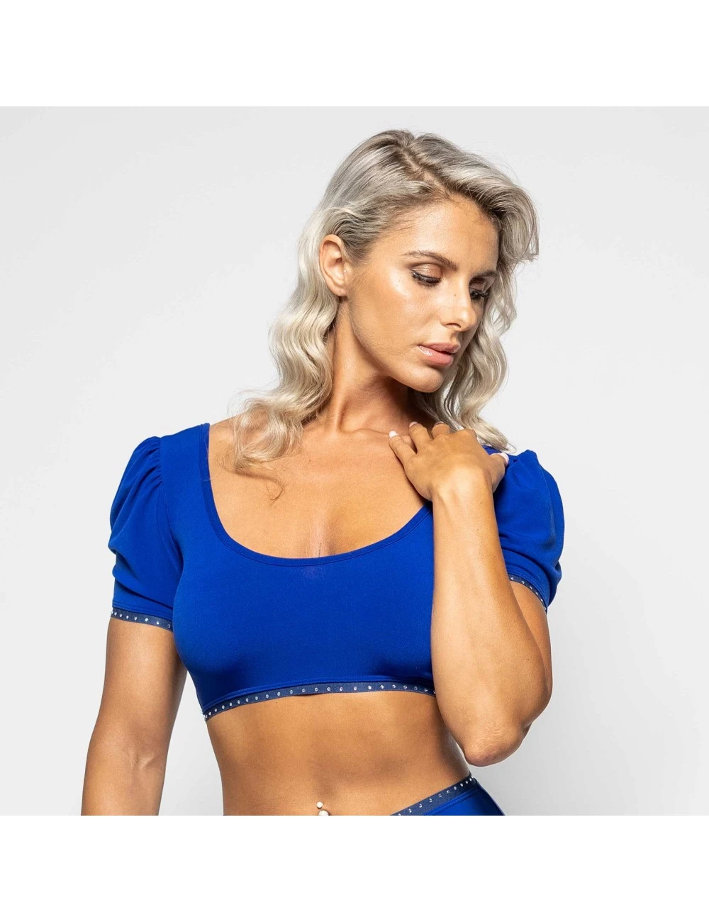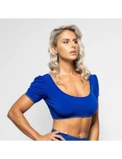 Top court bleu en lycra dotĂ© d’un joli dĂ©colletĂ©.