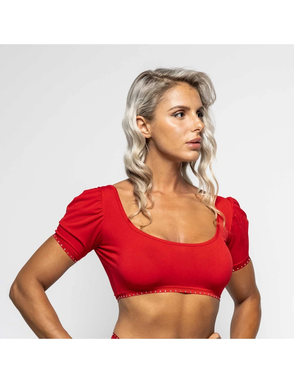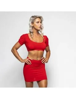 Top court rouge en lycra dotĂ© d’un joli dĂ©colletĂ©.
