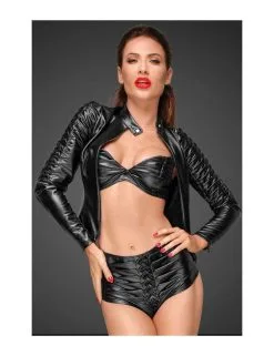 Veste moulante en vinyle noir, courte avec manches longues et zip intégral.